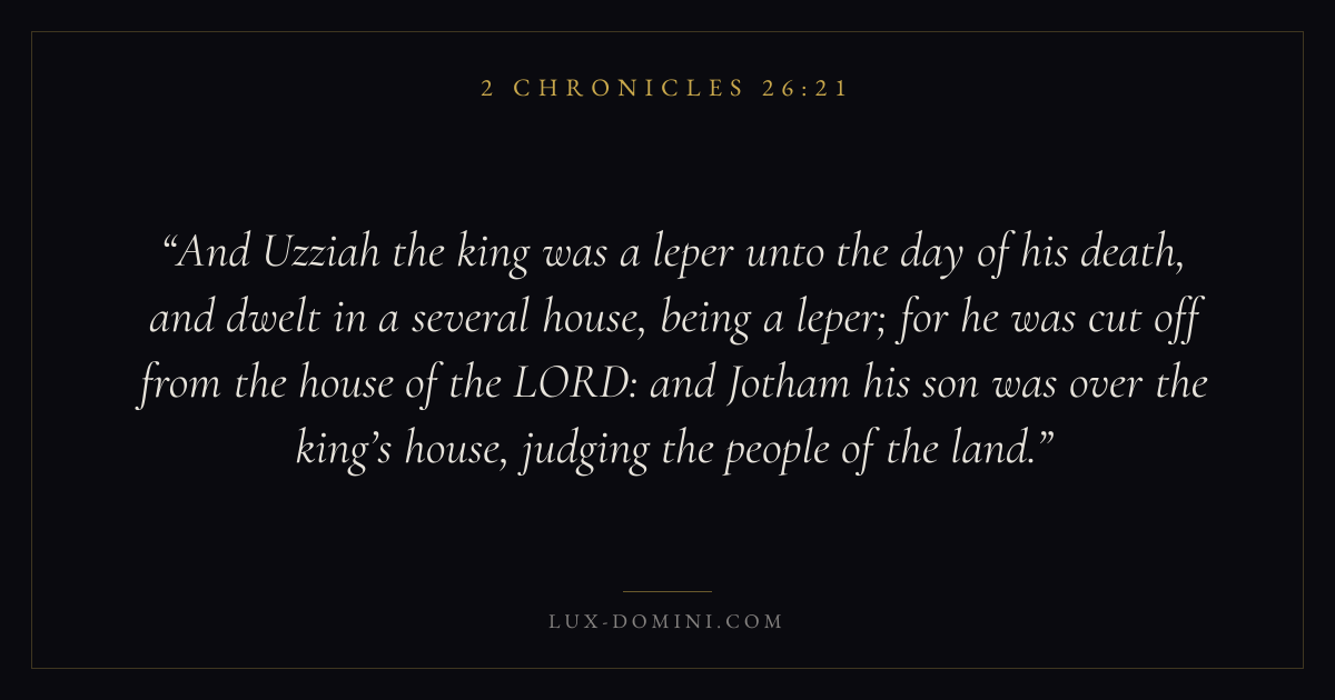 And Uzziah the king was a leper unto the day of his death, and dwelt in a several house, being a leper; for he was cut off from the house of the LORD: and Jotham his son was over the king’s house, judging the people of the land.
