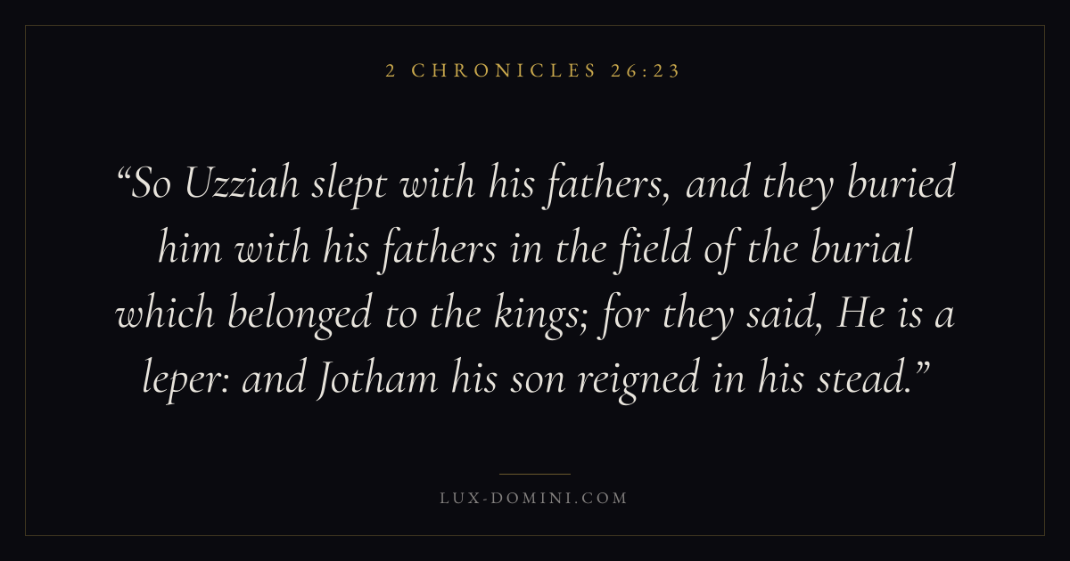 So Uzziah slept with his fathers, and they buried him with his fathers in the field of the burial which belonged to the kings; for they said, He is a leper: and Jotham his son reigned in his stead.