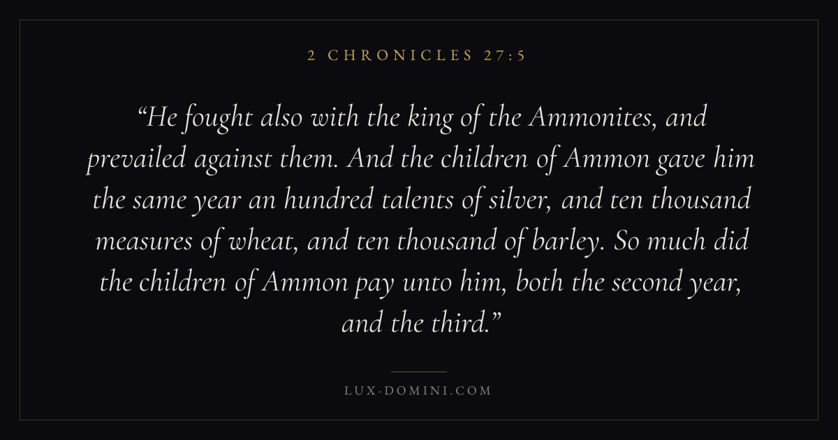 He fought also with the king of the Ammonites, and prevailed against them. And the children of Ammon gave him the same year an hundred talents of silver, and ten thousand measures of wheat, and ten thousand of barley. So much did the children of Ammon pay unto him, both the second year, and the third.