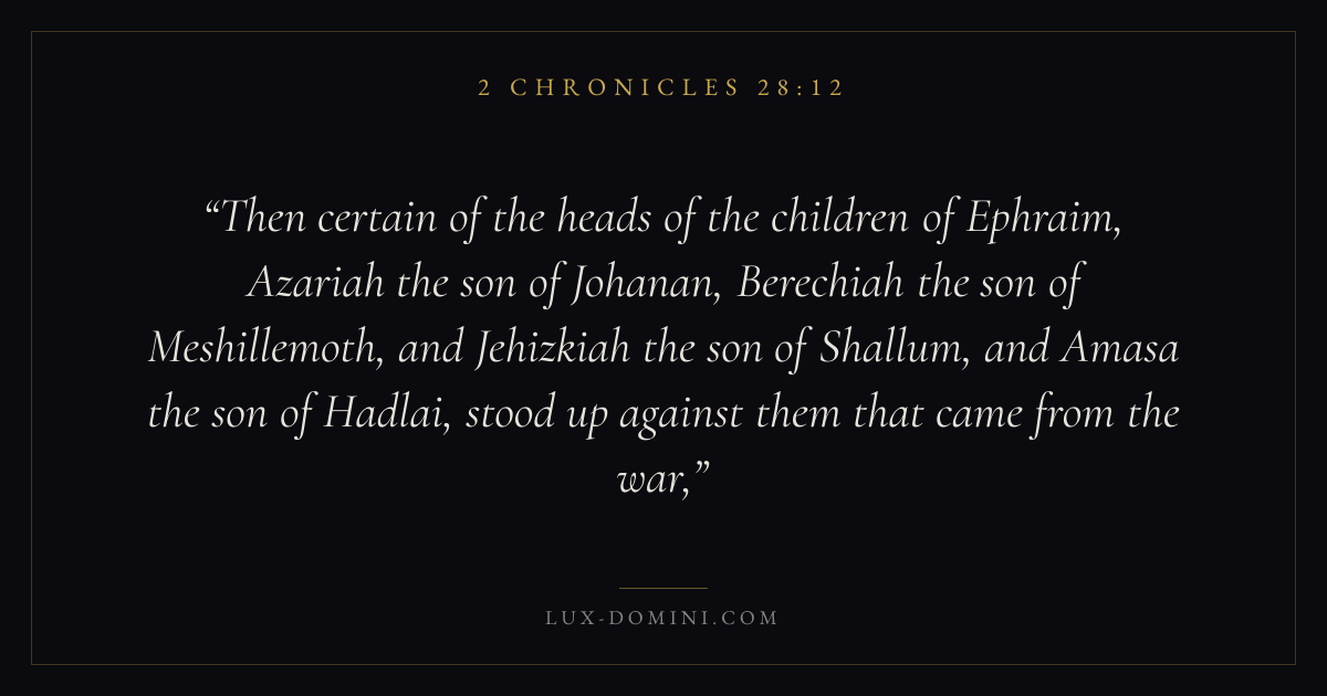 Then certain of the heads of the children of Ephraim, Azariah the son of Johanan, Berechiah the son of Meshillemoth, and Jehizkiah the son of Shallum, and Amasa the son of Hadlai, stood up against them that came from the war,