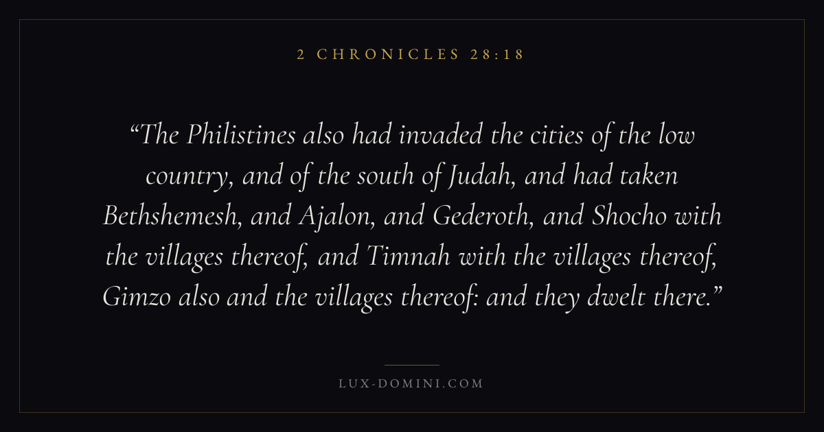 The Philistines also had invaded the cities of the low country, and of the south of Judah, and had taken Bethshemesh, and Ajalon, and Gederoth, and Shocho with the villages thereof, and Timnah with the villages thereof, Gimzo also and the villages thereof: and they dwelt there.