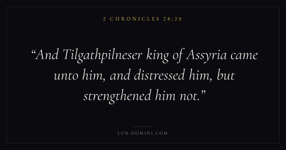 And Tilgathpilneser king of Assyria came unto him, and distressed him, but strengthened him not.