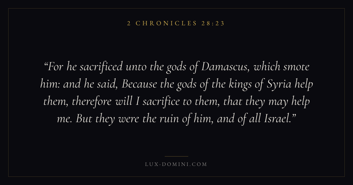 For he sacrificed unto the gods of Damascus, which smote him: and he said, Because the gods of the kings of Syria help them, therefore will I sacrifice to them, that they may help me. But they were the ruin of him, and of all Israel.
