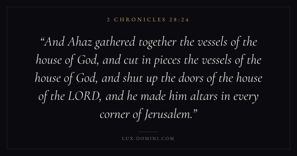 And Ahaz gathered together the vessels of the house of God, and cut in pieces the vessels of the house of God, and shut up the doors of the house of the LORD, and he made him altars in every corner of Jerusalem.