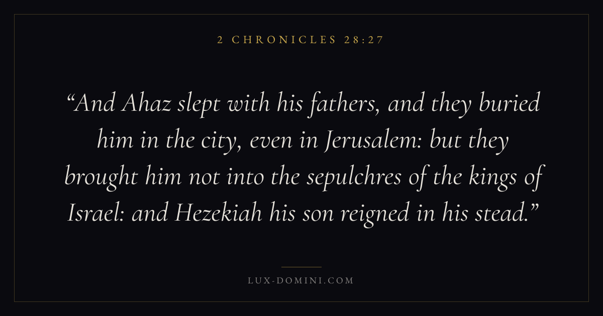 And Ahaz slept with his fathers, and they buried him in the city, even in Jerusalem: but they brought him not into the sepulchres of the kings of Israel: and Hezekiah his son reigned in his stead.