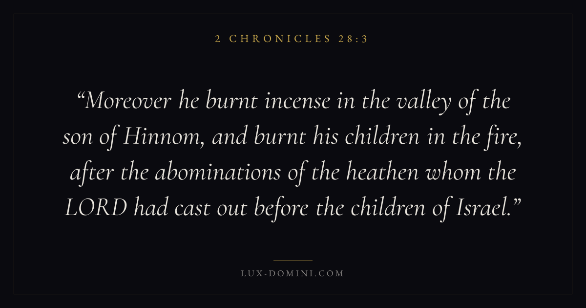 Moreover he burnt incense in the valley of the son of Hinnom, and burnt his children in the fire, after the abominations of the heathen whom the LORD had cast out before the children of Israel.