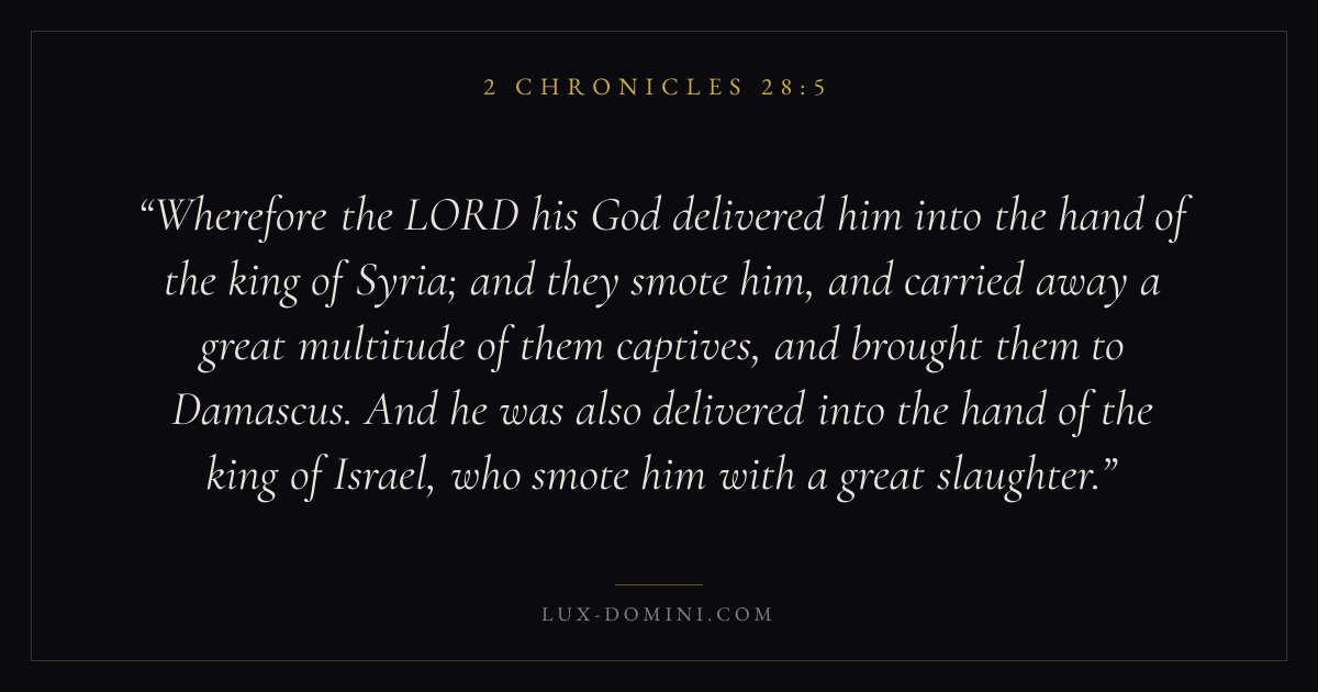 Wherefore the LORD his God delivered him into the hand of the king of Syria; and they smote him, and carried away a great multitude of them captives, and brought them to Damascus. And he was also delivered into the hand of the king of Israel, who smote him with a great slaughter.