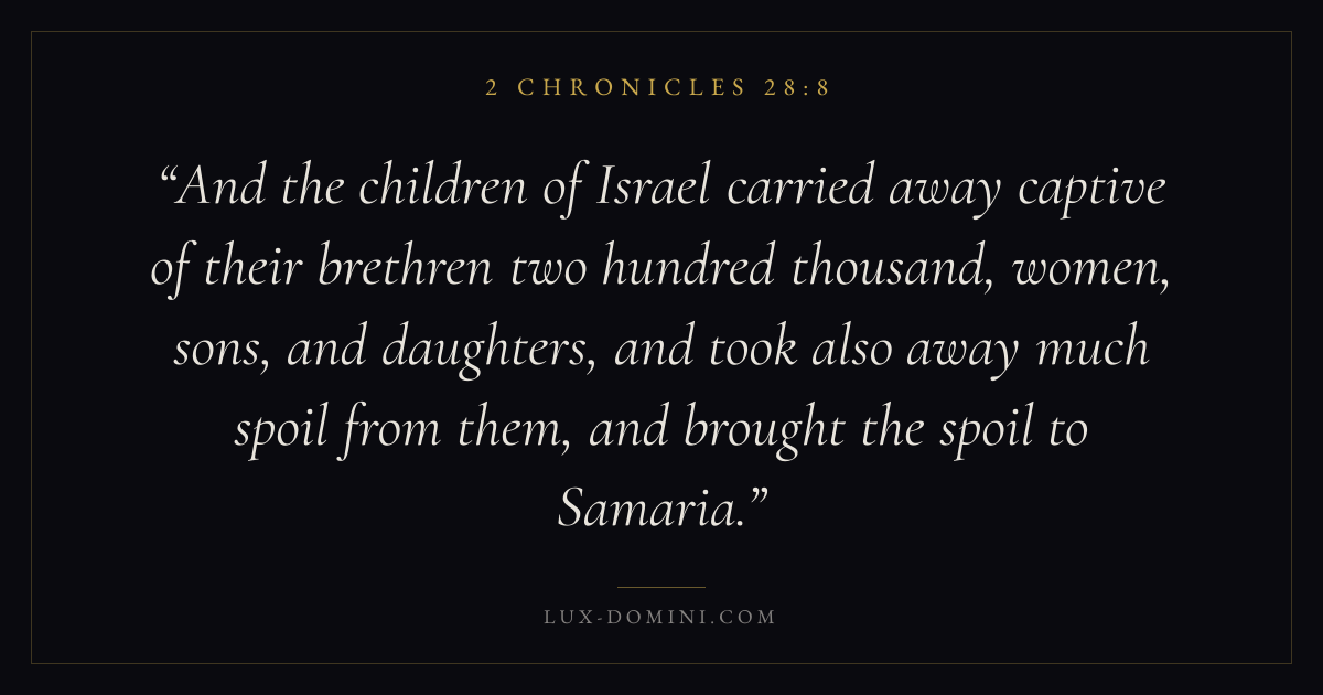And the children of Israel carried away captive of their brethren two hundred thousand, women, sons, and daughters, and took also away much spoil from them, and brought the spoil to Samaria.