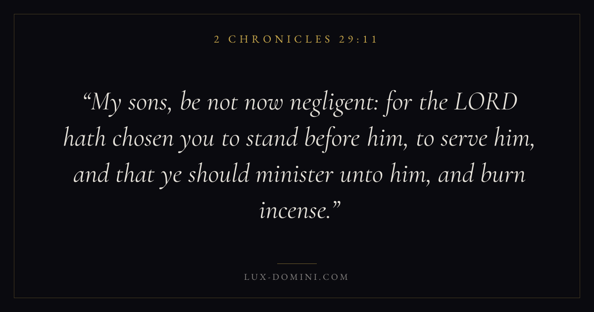 My sons, be not now negligent: for the LORD hath chosen you to stand before him, to serve him, and that ye should minister unto him, and burn incense.
