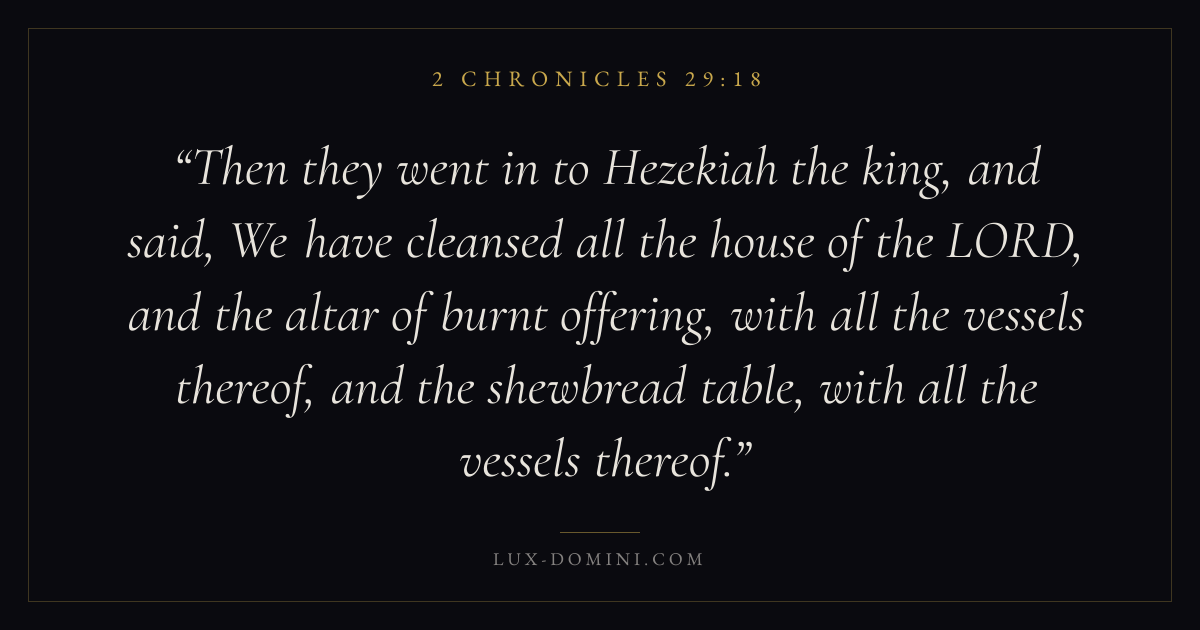 Then they went in to Hezekiah the king, and said, We have cleansed all the house of the LORD, and the altar of burnt offering, with all the vessels thereof, and the shewbread table, with all the vessels thereof.