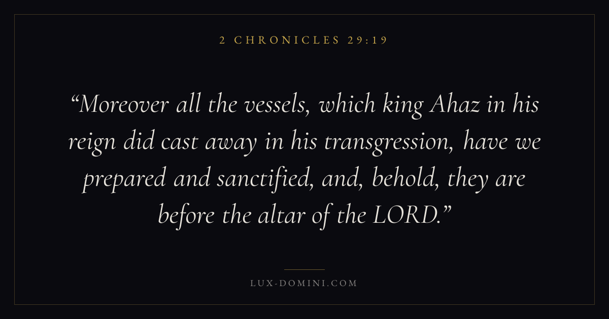 Moreover all the vessels, which king Ahaz in his reign did cast away in his transgression, have we prepared and sanctified, and, behold, they are before the altar of the LORD.