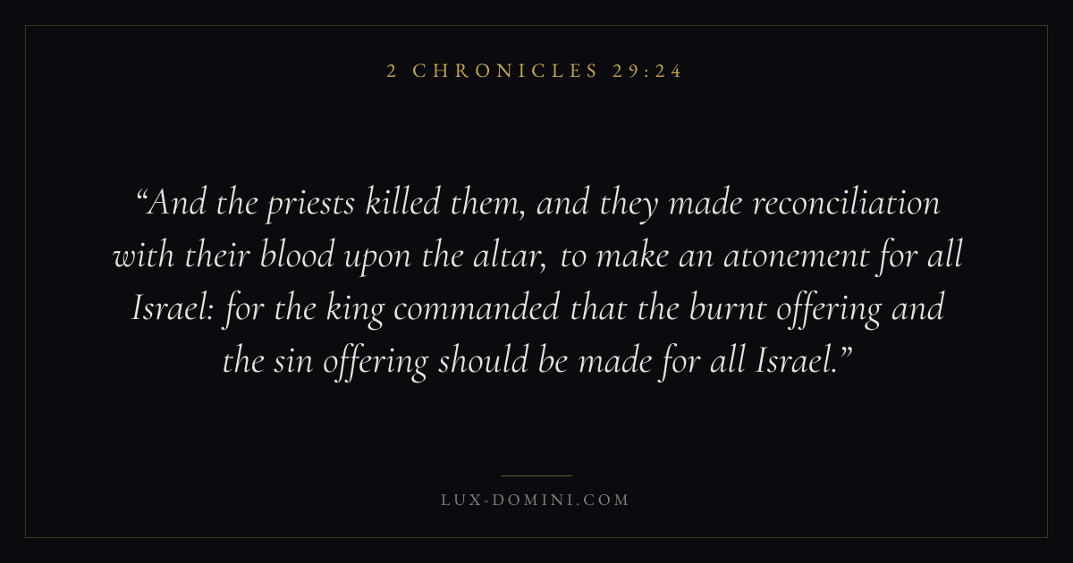 And the priests killed them, and they made reconciliation with their blood upon the altar, to make an atonement for all Israel: for the king commanded that the burnt offering and the sin offering should be made for all Israel.