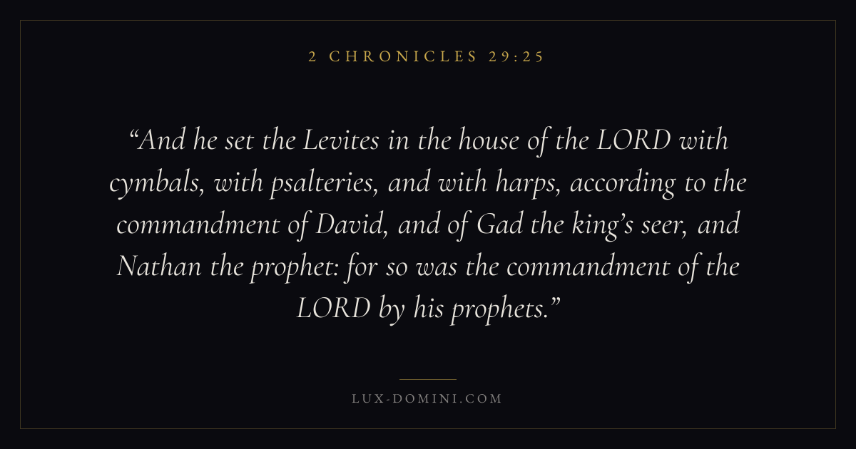 And he set the Levites in the house of the LORD with cymbals, with psalteries, and with harps, according to the commandment of David, and of Gad the king’s seer, and Nathan the prophet: for so was the commandment of the LORD by his prophets.