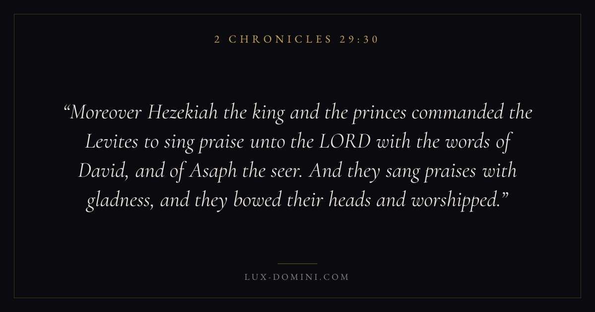Moreover Hezekiah the king and the princes commanded the Levites to sing praise unto the LORD with the words of David, and of Asaph the seer. And they sang praises with gladness, and they bowed their heads and worshipped.