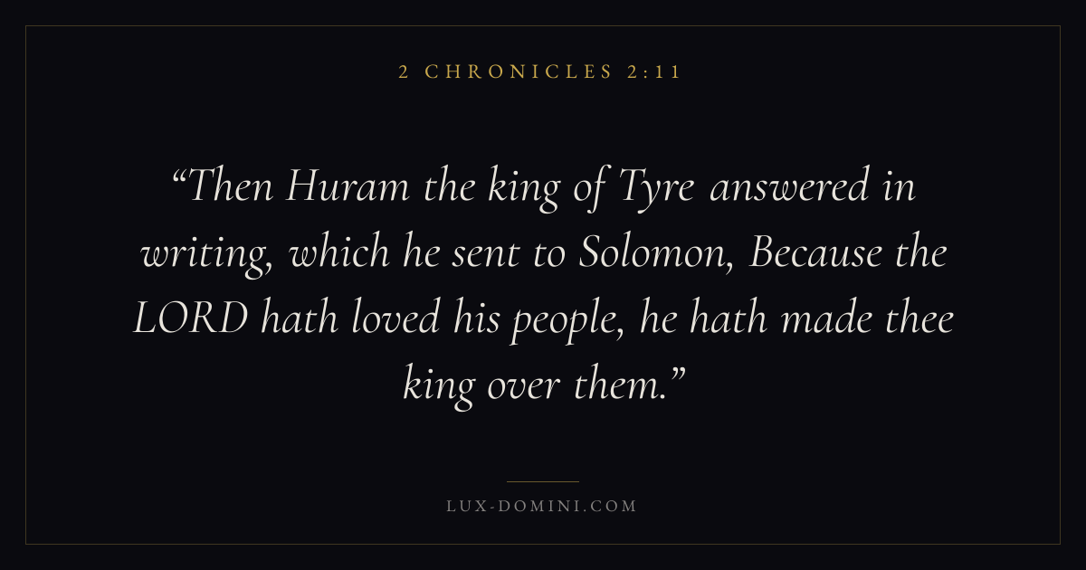 Then Huram the king of Tyre answered in writing, which he sent to Solomon, Because the LORD hath loved his people, he hath made thee king over them.