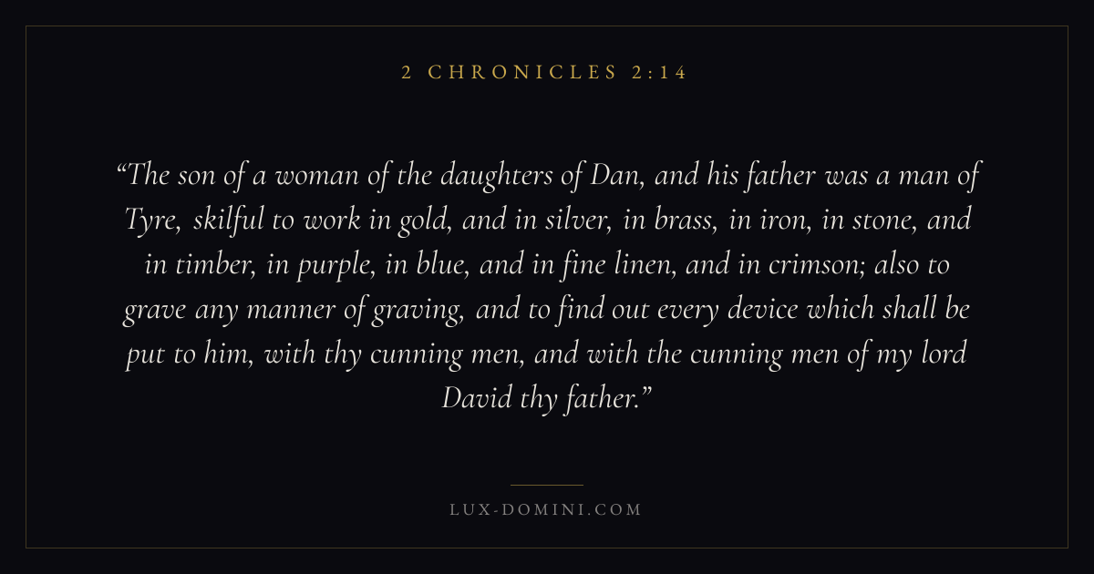 The son of a woman of the daughters of Dan, and his father was a man of Tyre, skilful to work in gold, and in silver, in brass, in iron, in stone, and in timber, in purple, in blue, and in fine linen, and in crimson; also to grave any manner of graving, and to find out every device which shall be put to him, with thy cunning men, and with the cunning men of my lord David thy father.