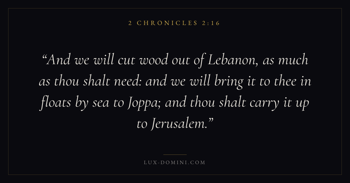 And we will cut wood out of Lebanon, as much as thou shalt need: and we will bring it to thee in floats by sea to Joppa; and thou shalt carry it up to Jerusalem.