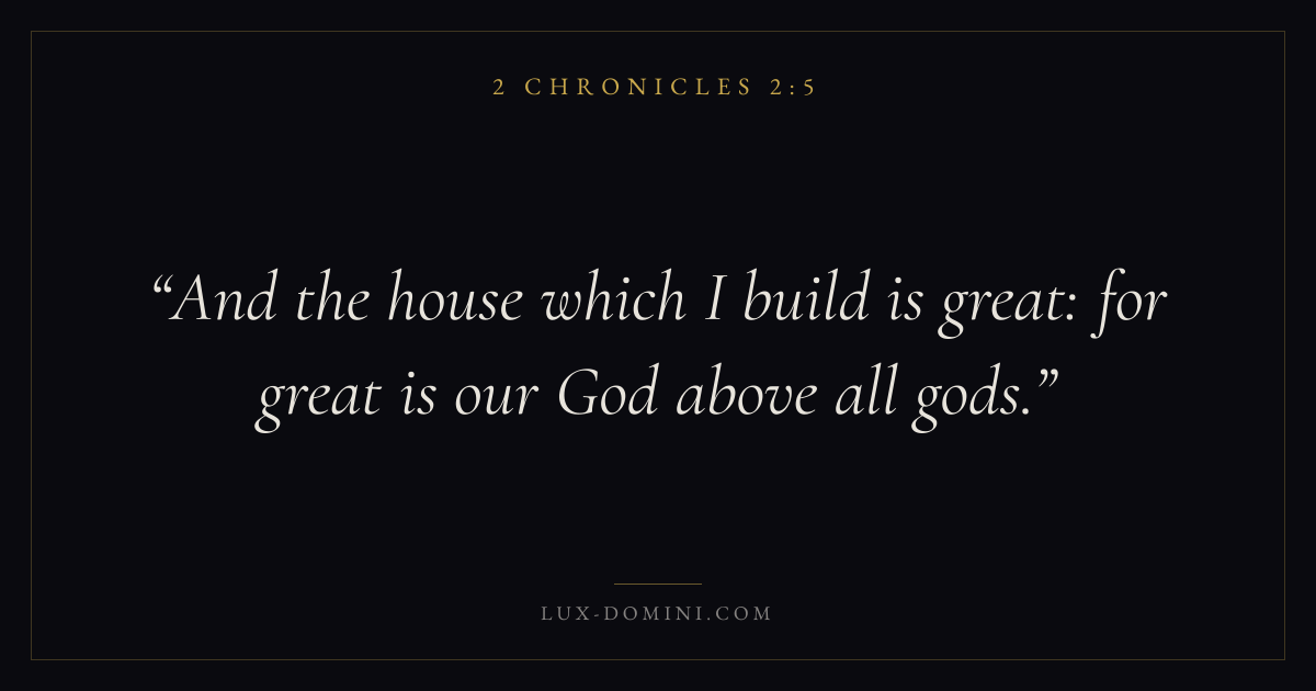 Books / 2 Chronicles / Chapter 2 / Verse 5 ← 2 Chronicles 2:4 2 Chronicles 2:5 2 Chronicles 2:6 → And the house which I build is great: for great is our God above all gods. Download verse card Share on Twitter Share on Facebook Pin it ✦ Key themes PrayerJustice and mercyTempleReform Read with 2 Chronicles 2:32 Chronicles 2:4Matthew 6:9Luke 18:1 Related topics Bible verses about prayerBible verses about justice and mercy ✦ 2 Chronicles Chapter 2 verses V. 1 V. 2 V. 3 V. 4 V. 5 V. 6 V. 7 V. 8 V. 9 V. 10 V. 11 V. 12 V. 13 V. 14 V. 15 V. 16 V. 17 V. 18