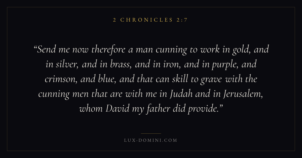 Send me now therefore a man cunning to work in gold, and in silver, and in brass, and in iron, and in purple, and crimson, and blue, and that can skill to grave with the cunning men that are with me in Judah and in Jerusalem, whom David my father did provide.