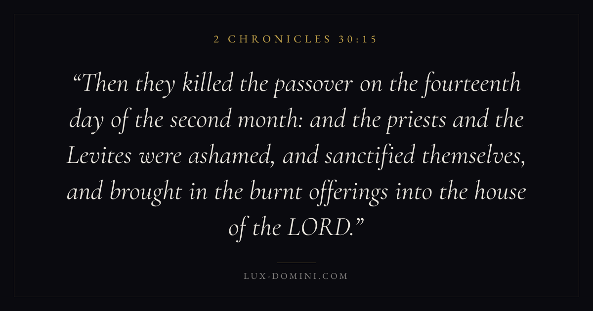 Then they killed the passover on the fourteenth day of the second month: and the priests and the Levites were ashamed, and sanctified themselves, and brought in the burnt offerings into the house of the LORD.