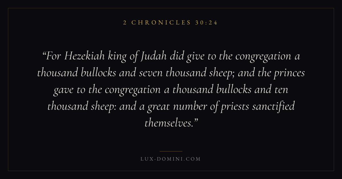 For Hezekiah king of Judah did give to the congregation a thousand bullocks and seven thousand sheep; and the princes gave to the congregation a thousand bullocks and ten thousand sheep: and a great number of priests sanctified themselves.