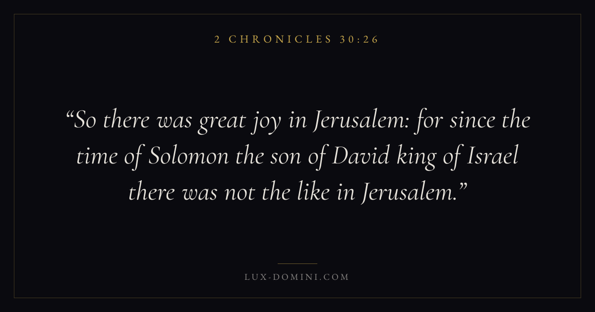 So there was great joy in Jerusalem: for since the time of Solomon the son of David king of Israel there was not the like in Jerusalem.