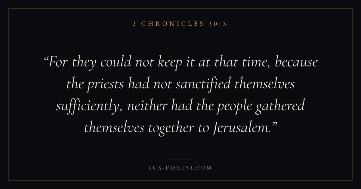 For they could not keep it at that time, because the priests had not sanctified themselves sufficiently, neither had the people gathered themselves together to Jerusalem.