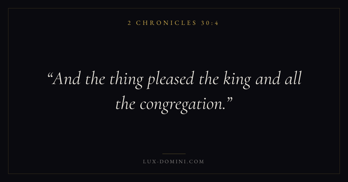 Books / 2 Chronicles / Chapter 30 / Verse 4 ← 2 Chronicles 30:3 2 Chronicles 30:4 2 Chronicles 30:5 → And the thing pleased the king and all the congregation. Download verse card Share on Twitter Share on Facebook Pin it ✦ Key themes PrayerJustice and mercyTempleReform Read with 2 Chronicles 30:12 Chronicles 30:2Matthew 6:9Luke 18:1 Related topics Bible verses about prayerBible verses about justice and mercy ✦ 2 Chronicles Chapter 30 verses V. 1 V. 2 V. 3 V. 4 V. 5 V. 6 V. 7 V. 8 V. 9 V. 10 V. 11 V. 12 V. 13 V. 14 V. 15 V. 16 V. 17 V. 18 V. 19 V. 20 V. 21 V. 22 V. 23 V. 24 V. 25 V. 26 V. 27
