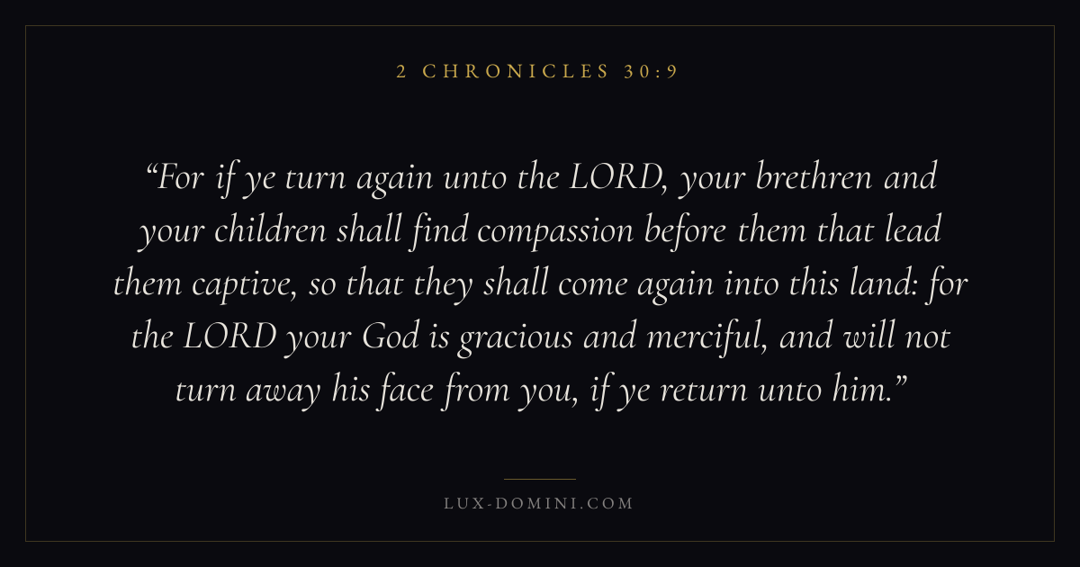 For if ye turn again unto the LORD, your brethren and your children shall find compassion before them that lead them captive, so that they shall come again into this land: for the LORD your God is gracious and merciful, and will not turn away his face from you, if ye return unto him.