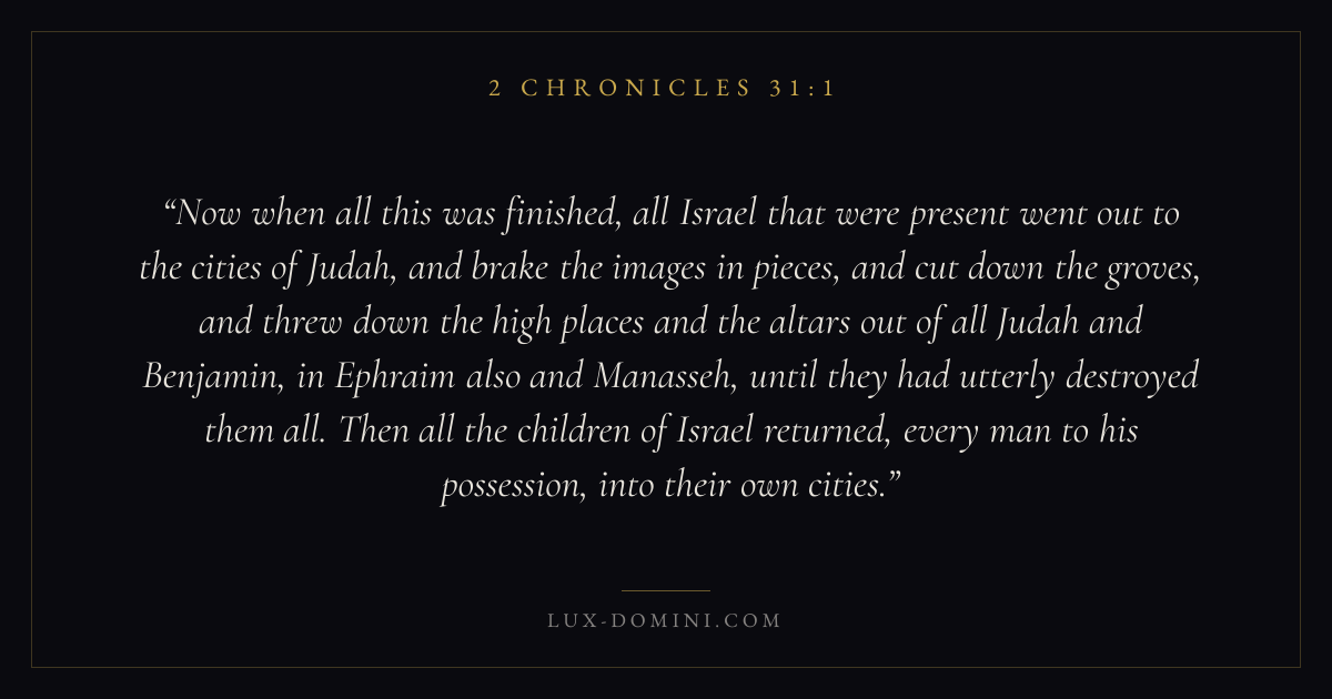 Now when all this was finished, all Israel that were present went out to the cities of Judah, and brake the images in pieces, and cut down the groves, and threw down the high places and the altars out of all Judah and Benjamin, in Ephraim also and Manasseh, until they had utterly destroyed them all. Then all the children of Israel returned, every man to his possession, into their own cities.