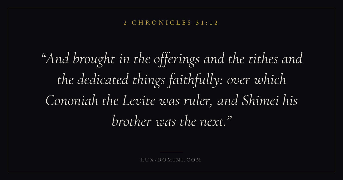 And brought in the offerings and the tithes and the dedicated things faithfully: over which Cononiah the Levite was ruler, and Shimei his brother was the next.