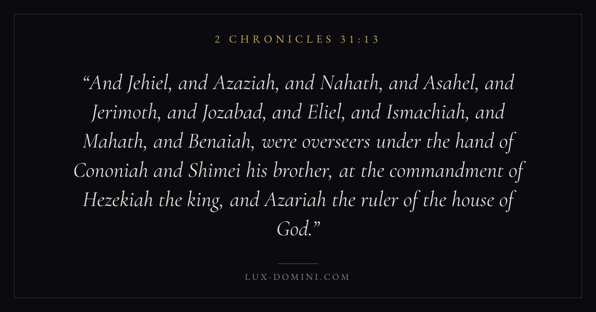 And Jehiel, and Azaziah, and Nahath, and Asahel, and Jerimoth, and Jozabad, and Eliel, and Ismachiah, and Mahath, and Benaiah, were overseers under the hand of Cononiah and Shimei his brother, at the commandment of Hezekiah the king, and Azariah the ruler of the house of God.
