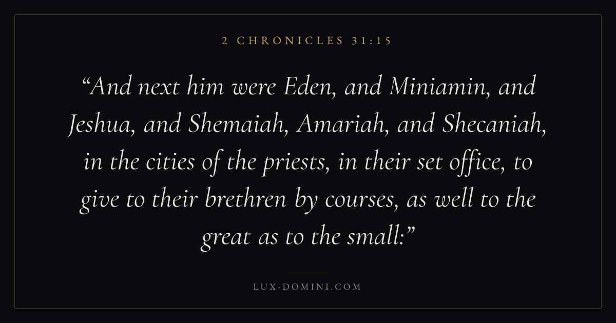 And next him were Eden, and Miniamin, and Jeshua, and Shemaiah, Amariah, and Shecaniah, in the cities of the priests, in their set office, to give to their brethren by courses, as well to the great as to the small: