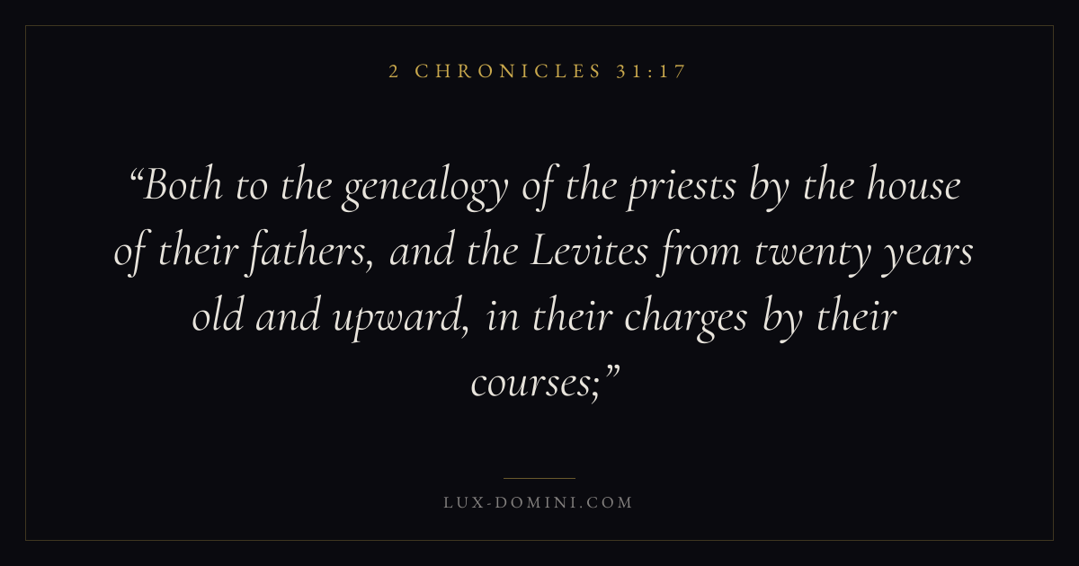 Both to the genealogy of the priests by the house of their fathers, and the Levites from twenty years old and upward, in their charges by their courses;