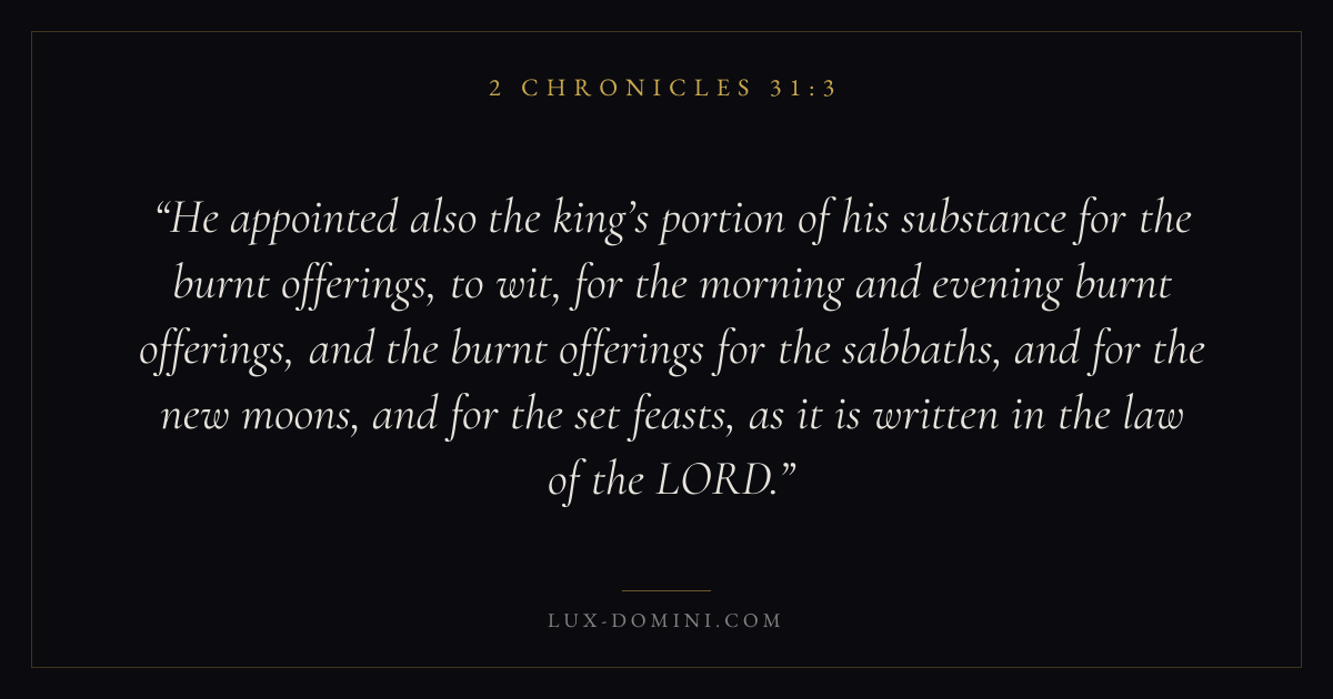 He appointed also the king’s portion of his substance for the burnt offerings, to wit, for the morning and evening burnt offerings, and the burnt offerings for the sabbaths, and for the new moons, and for the set feasts, as it is written in the law of the LORD.