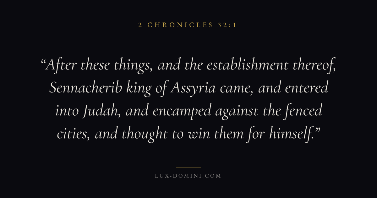 After these things, and the establishment thereof, Sennacherib king of Assyria came, and entered into Judah, and encamped against the fenced cities, and thought to win them for himself.