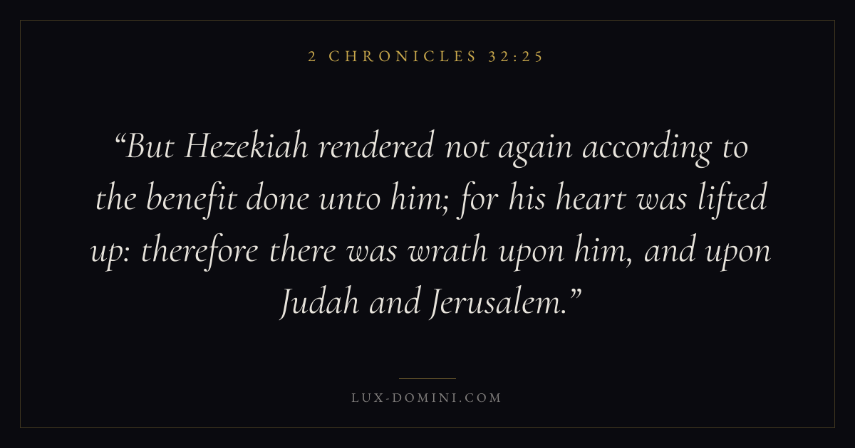 But Hezekiah rendered not again according to the benefit done unto him; for his heart was lifted up: therefore there was wrath upon him, and upon Judah and Jerusalem.