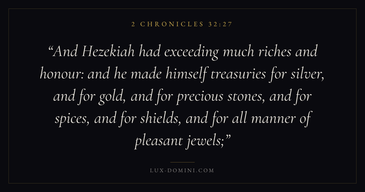 And Hezekiah had exceeding much riches and honour: and he made himself treasuries for silver, and for gold, and for precious stones, and for spices, and for shields, and for all manner of pleasant jewels;