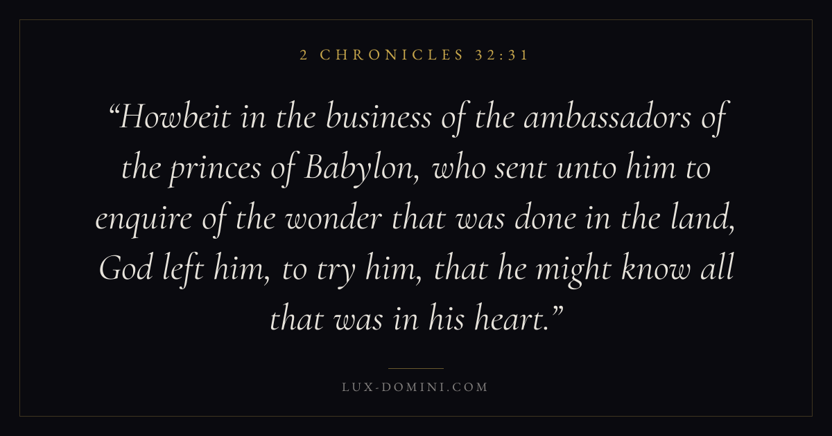 Howbeit in the business of the ambassadors of the princes of Babylon, who sent unto him to enquire of the wonder that was done in the land, God left him, to try him, that he might know all that was in his heart.