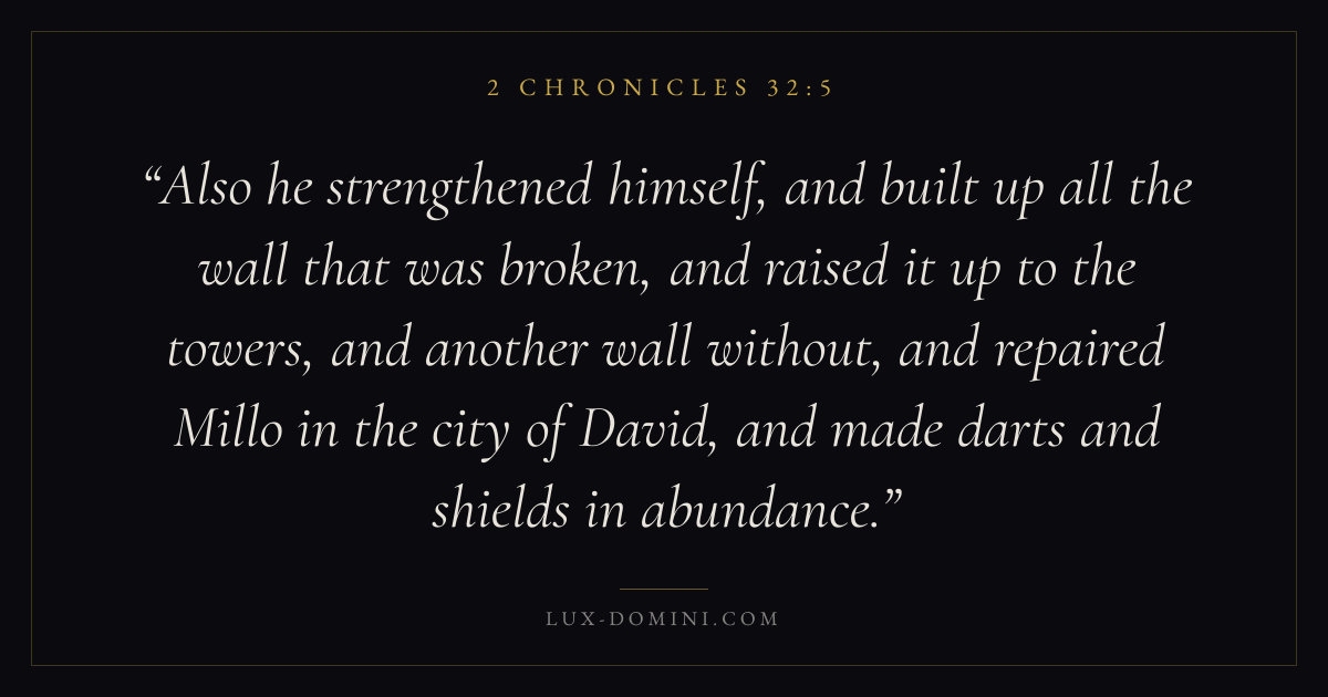 Also he strengthened himself, and built up all the wall that was broken, and raised it up to the towers, and another wall without, and repaired Millo in the city of David, and made darts and shields in abundance.