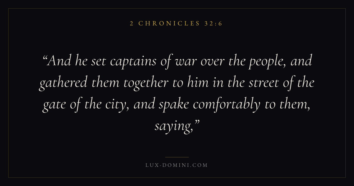 And he set captains of war over the people, and gathered them together to him in the street of the gate of the city, and spake comfortably to them, saying,