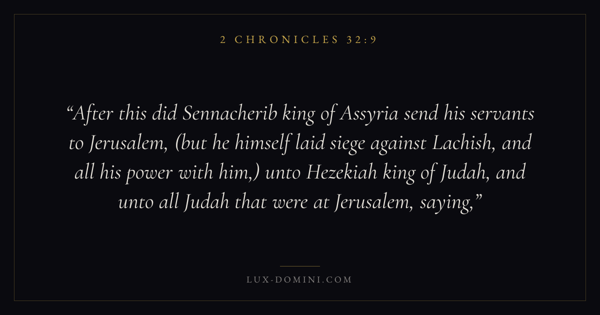 After this did Sennacherib king of Assyria send his servants to Jerusalem, (but he himself laid siege against Lachish, and all his power with him,) unto Hezekiah king of Judah, and unto all Judah that were at Jerusalem, saying,
