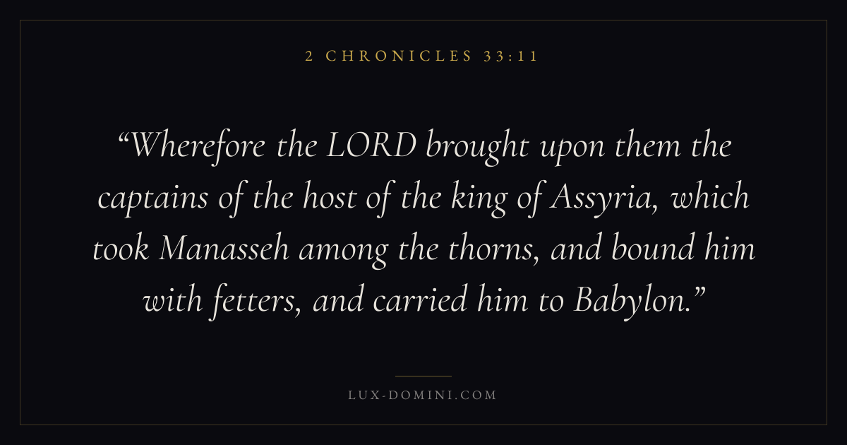 Wherefore the LORD brought upon them the captains of the host of the king of Assyria, which took Manasseh among the thorns, and bound him with fetters, and carried him to Babylon.