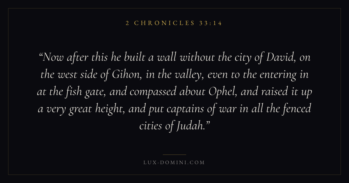 Now after this he built a wall without the city of David, on the west side of Gihon, in the valley, even to the entering in at the fish gate, and compassed about Ophel, and raised it up a very great height, and put captains of war in all the fenced cities of Judah.