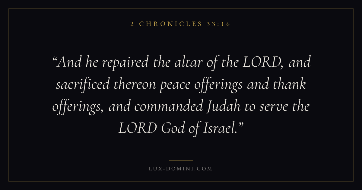 And he repaired the altar of the LORD, and sacrificed thereon peace offerings and thank offerings, and commanded Judah to serve the LORD God of Israel.