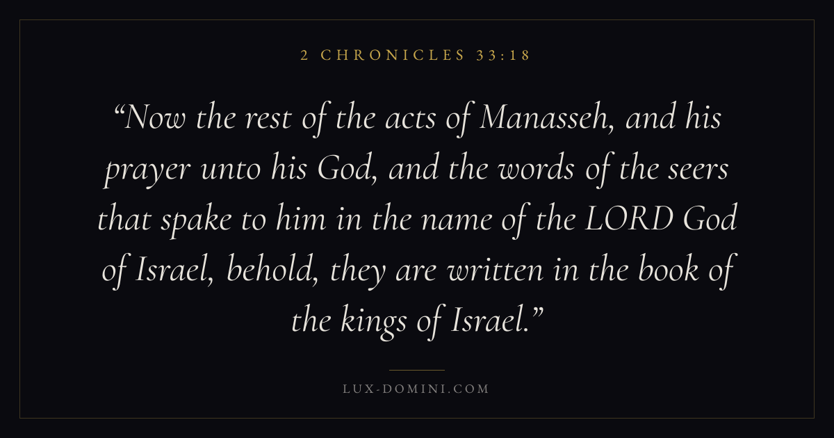 Now the rest of the acts of Manasseh, and his prayer unto his God, and the words of the seers that spake to him in the name of the LORD God of Israel, behold, they are written in the book of the kings of Israel.