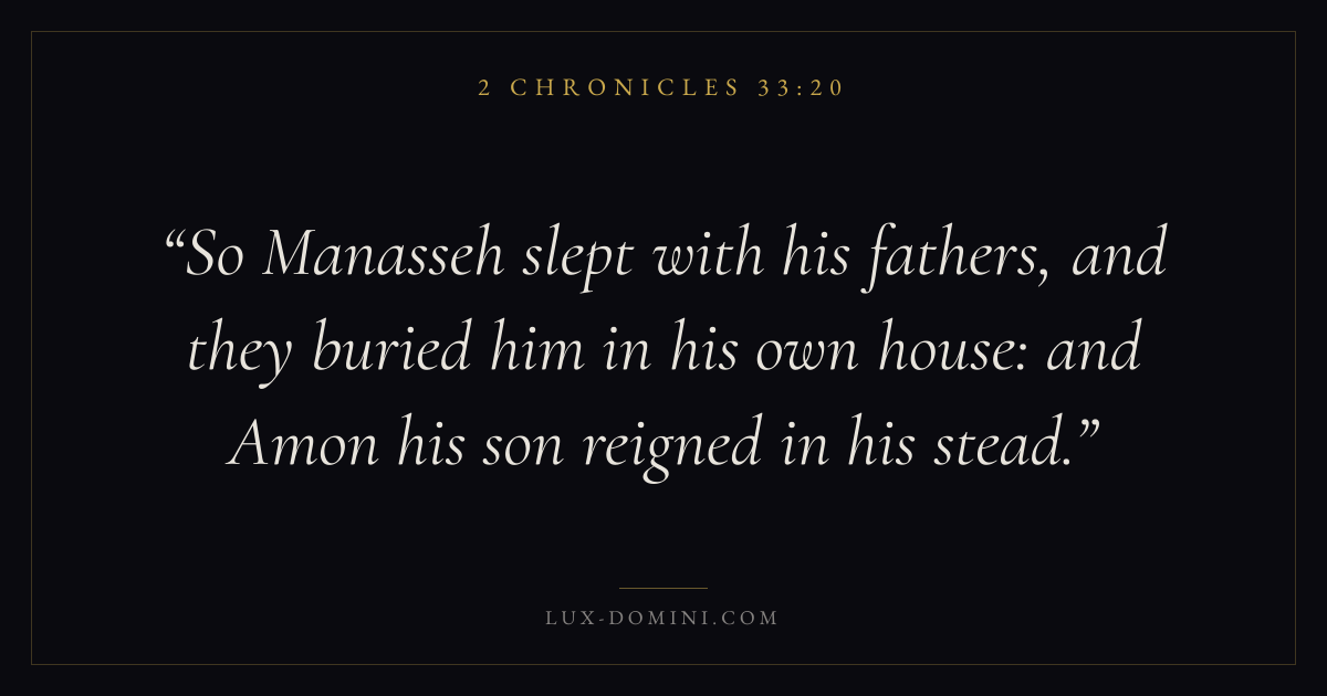 So Manasseh slept with his fathers, and they buried him in his own house: and Amon his son reigned in his stead.