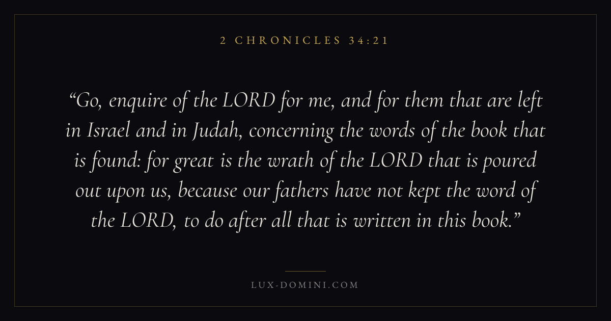 Go, enquire of the LORD for me, and for them that are left in Israel and in Judah, concerning the words of the book that is found: for great is the wrath of the LORD that is poured out upon us, because our fathers have not kept the word of the LORD, to do after all that is written in this book.