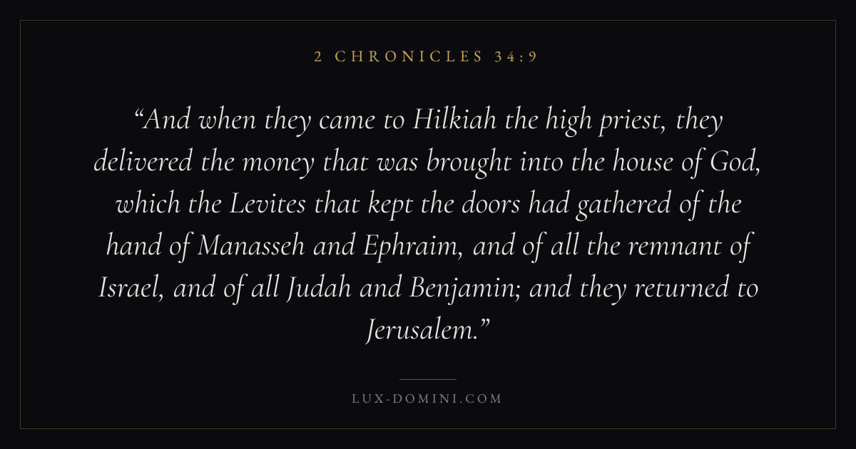 And when they came to Hilkiah the high priest, they delivered the money that was brought into the house of God, which the Levites that kept the doors had gathered of the hand of Manasseh and Ephraim, and of all the remnant of Israel, and of all Judah and Benjamin; and they returned to Jerusalem.
