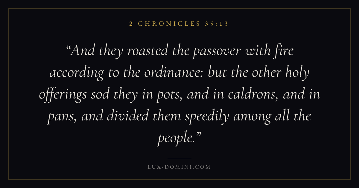 And they roasted the passover with fire according to the ordinance: but the other holy offerings sod they in pots, and in caldrons, and in pans, and divided them speedily among all the people.